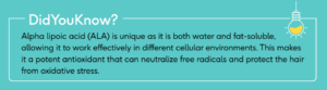 The antioxidant and anti-inflammatory properties of alpha lipoic acid help protect hair follicles from damage and inflammation, which can contribute to hair loss. By maintaining a healthy scalp environment, ALA reduces the risk of hair loss and supports overall hair health.