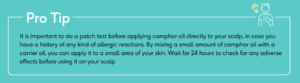 If you’re wondering if camphor is good for hair or not always do a patch test before use on the skin or scalp. Apply diluted camphor oil to the skin and wait 24 hours to check for any allergic reaction.